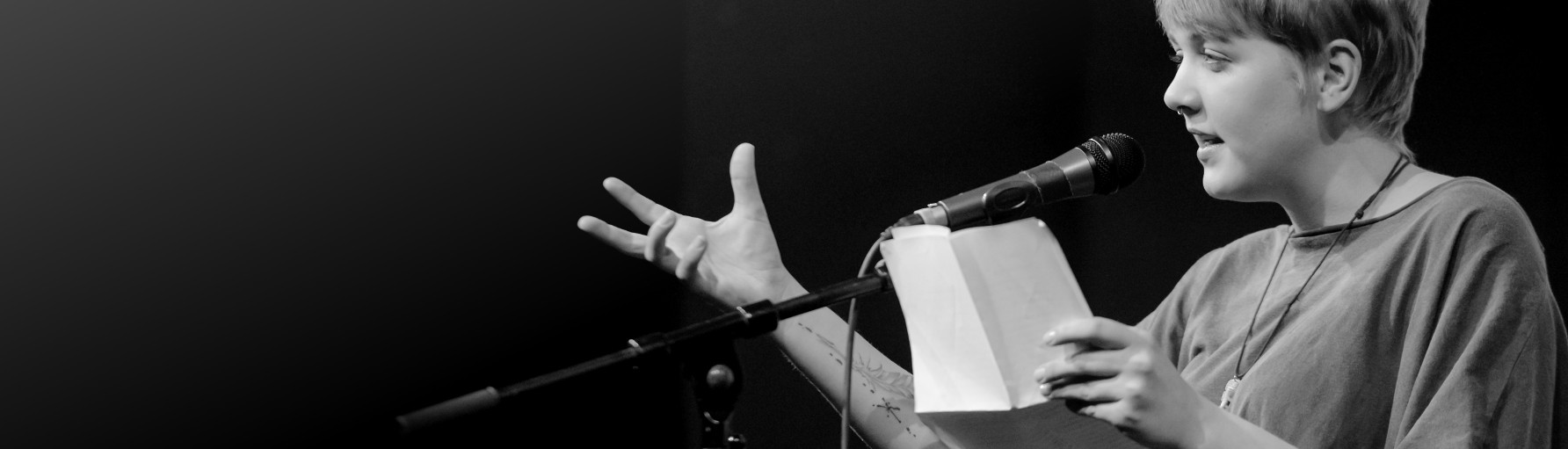 Poetry Slam ist "das" literarische Phänomen der letzten Jahre. Zu hunderten oder gar zu tausenden strömen Zuschauer zu den Dichterwettkämpfen, um zu sehen wie Texte auf Bühnen zum Leben erweckt werden können.Der offene Dichter*innenwettstreit arbeitet mit einem weiten Literaturbegriff: Lyrik, Prosa, Rap, Limmericks, Kurzgeschichten, Dialoge, Wahnsinn oder was auch immer sonst auf die Bühne kommt. Die Regeln sind denkbar einfach: Hauptsache die Texte sind selbstgeschrieben, werden ohne Hilfsmittel dargeboten und passen in 7 Minuten. Und jede und jeder ist eingeladen, seine Texte dem Slampublikum zu präsentieren. Klar gibt’s auch ein bisschen Wettbewerb, schließlich kann man auch was gewinnen, aber so entscheidend ist das dann doch nicht. Denn: "The points are not the point. The point is poetry." Der Wettbewerb lädt v.a. das Publikum zum genauen Zuhören und Mitfiebern ein, da sie selbst am Ende der Veranstaltung abstimmen und damit die Gewinnerin oder den Gewinner wählen. Die Preise haben dabei einen symbolischen Wert, der Auftritt und die direkte Resonanz des Publikum sind das Entscheidende für die Auftretenden dient ihnen als Ansporn für die weitere Arbeit an Texten und Performance.
